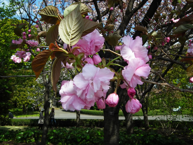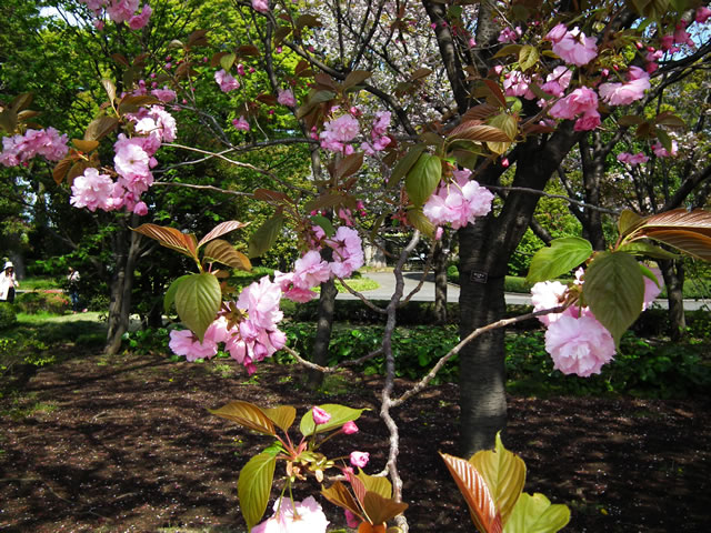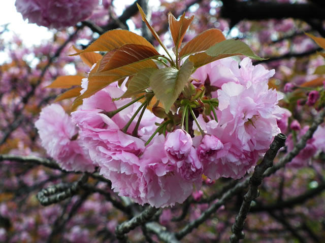 「花は大輪、八重咲き、濃紅色、八重桜の代表品種、花の塩漬けは桜湯となる。」