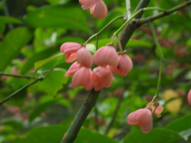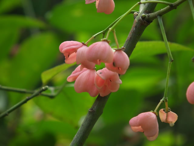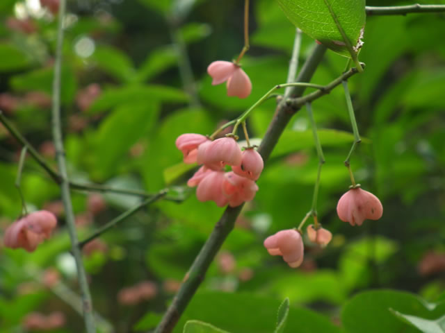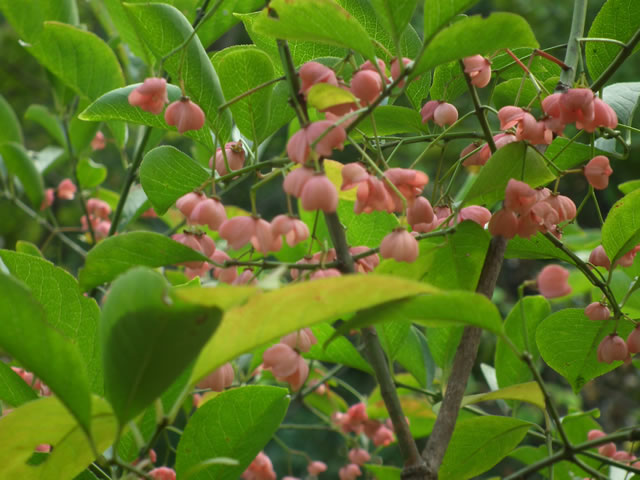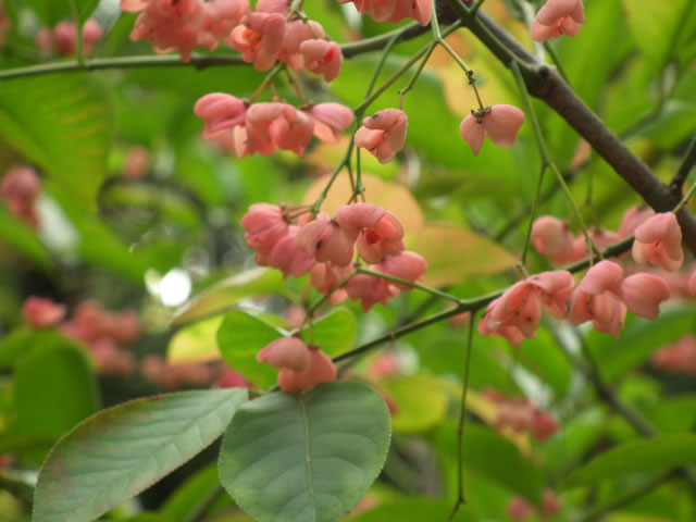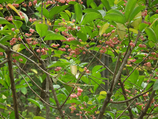 マユミは、落葉低木。初夏に緑の花、秋に赤い実をつけます。