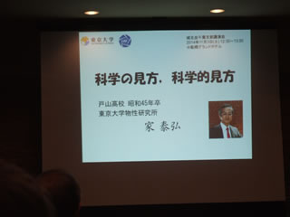 特別講演:「科学の見方、科学的見方」:家 泰弘 東京大学物性研究所教授。理学博士 の家 泰弘さん(S45)の講演です。内容は、明年の城北会千葉支部会報・第12号に発表予定です。 先生の御著書は、丸善発行の「自然のしくみ百科 宇宙からDNAまで" 」などがあります。 --> 戻るページトップ