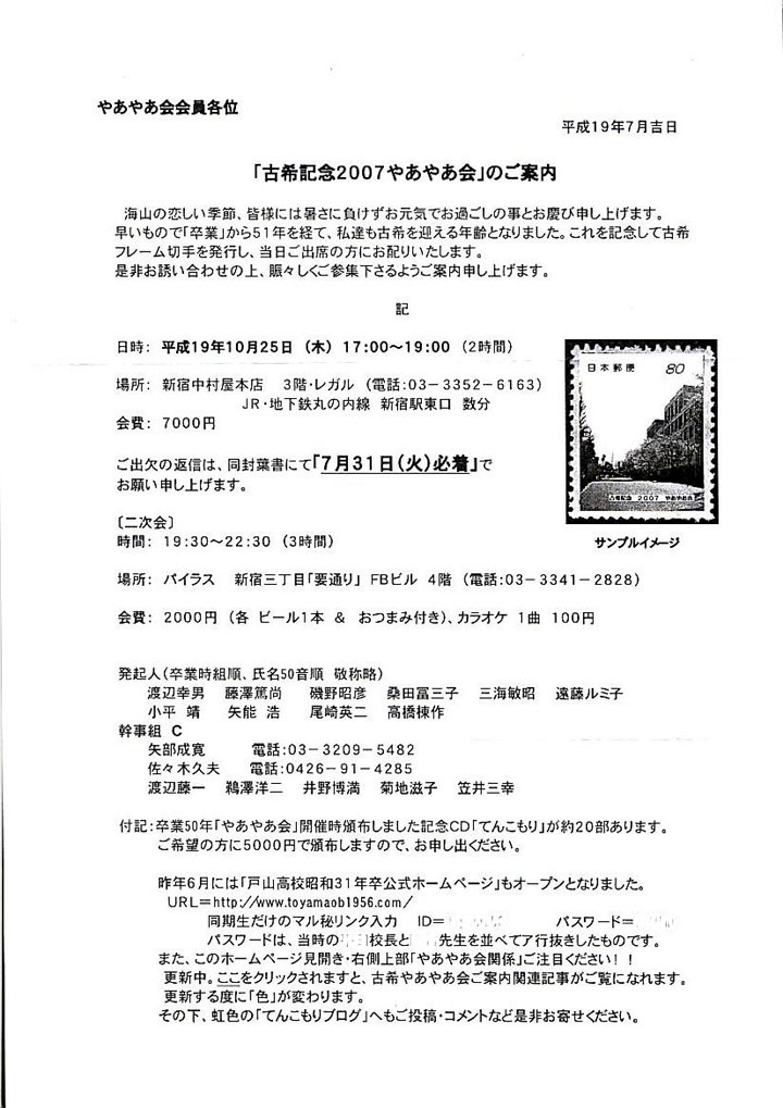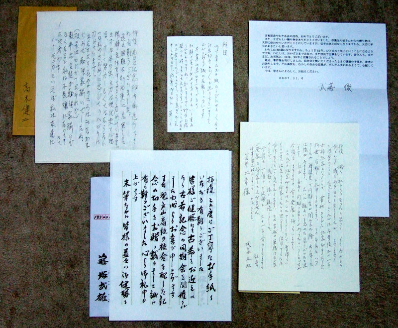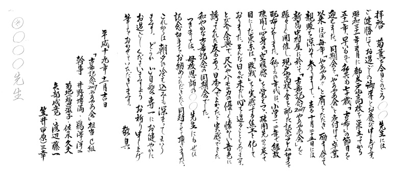 恩師七名様へのご挨拶 古希やあやあ会の打ち上げ後、11月2日に、直接お世話になった恩師七名様に、左記のご挨拶状と記念のフレーム切手をお送りしました。恩師の方々は83~4歳と存じますが、お元気のご様子にて、着信早々全先生より、電話やお手紙でご返事を頂戴しました。今回の「小さな切手」から、思いがけない喜びや、戸山の記憶が立ち昇って懐かしさいっぱいのご様子でした。ありがたいことでございます。