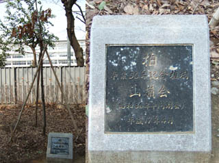 同じく「柏」の記念樹です。『山嶺会』は昭和30年(サンレイでしょうね)卒業生の同期会です。最近卒業50周年の記念植樹をされました。いまだ、幼い柏ですが、立派な記念碑をもらいガンバッテいるようです。(我々の柏が先行者ですね)