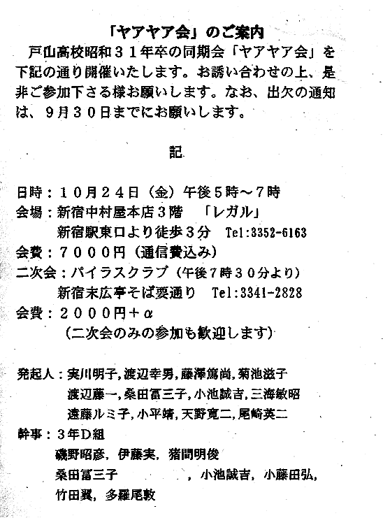 問題処理にたけたE組有志の方々は、手早く『2009年・やあやあ会は2009年10月24日(土)開催、会場予定は今回と同じ新宿中村屋本店3階レガル』と発表されました。皆様のご参加をお待ちします。