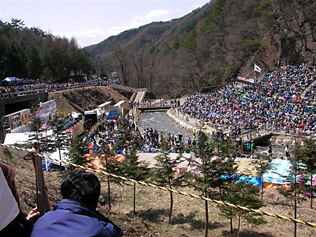 七年に一度の御柱祭「木落し」を見ようと、「木落し坂」の正面、国道142号線と砥川の河川敷は、76000人の人々で埋め尽くされました。