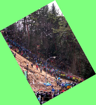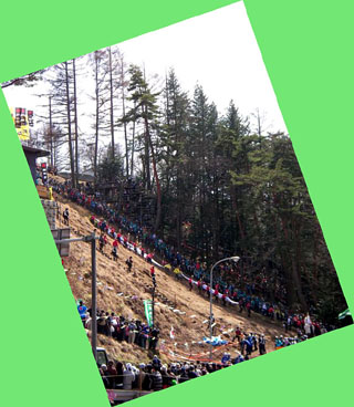 御柱祭は、西暦804年・桓武天皇の時代から記録に残っているもので、7年に一度(十二支の寅と申の歳)に前記の巨大な神木を、新しいものに入れ替える行事です。諏訪地方の6市町村21万人参加・2~3000人の直接労力奉仕で、動力・牛馬はもとより、車輪・コロも使わず人力のみで約10キロメートルの山道を10tonの木材を、曳き降ろす行事を続けてきました。左の写真はその難所「木落し坂」です。