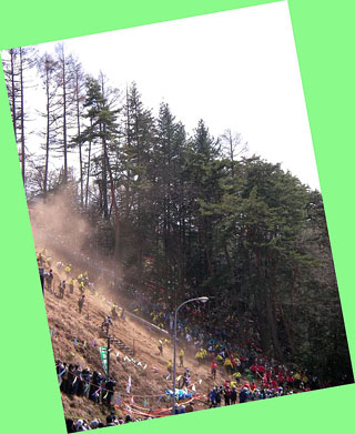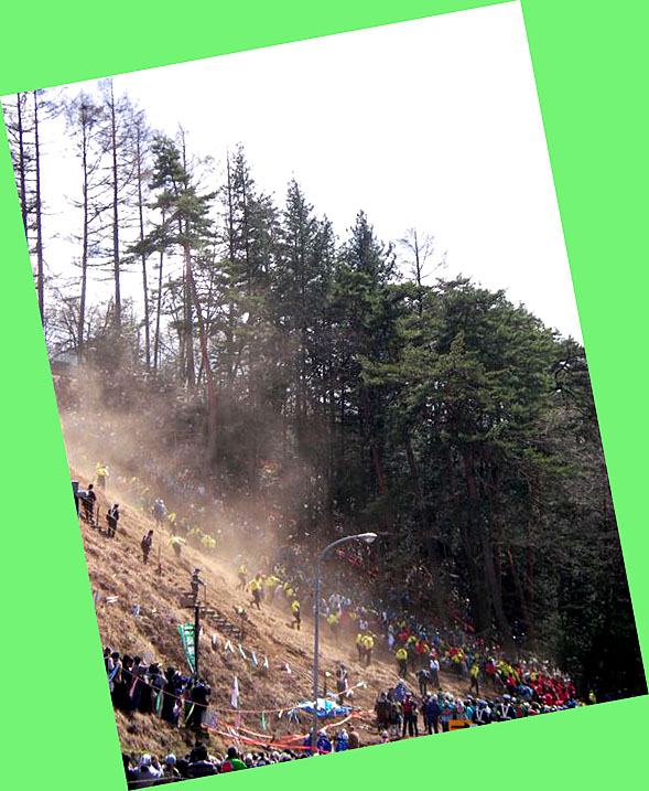 準備が整うと、綱が切断され、御柱は人を乗せたまま土煙をあげ轟音を響かせながら、坂を突き進みます(←)。