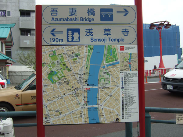 待ち合わせ場所の東京メトロ浅草駅の4番出口を出ると、隅田川河畔で、吾妻橋と、浅草寺への案内があります。