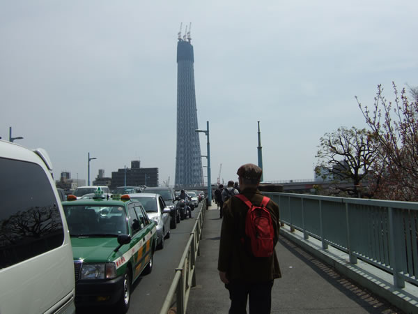 対岸にわたる為に、「言問橋」を渡ると丁度正面に、建設中の東京スカイツリーが見えます。野口先生の書物によれば『在原業平の東下り(862年)は十数人の供をつれ、馬に乗った官費旅行』で、コースは『国府(現府中市)から東に向い、今の杉並区天沼・北区西ヶ原を経て、台東区橋場付近で隅田川を渡り、墨田区向島辺に至ったと推定』とのこと。言問いの渡し・業平橋・言問橋などは後世の創作とのこと(Page174)です。