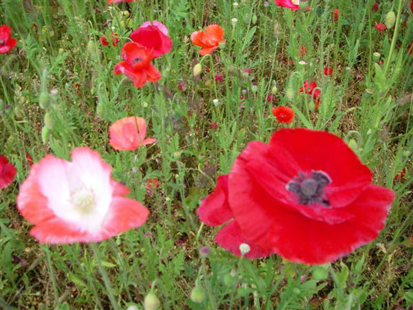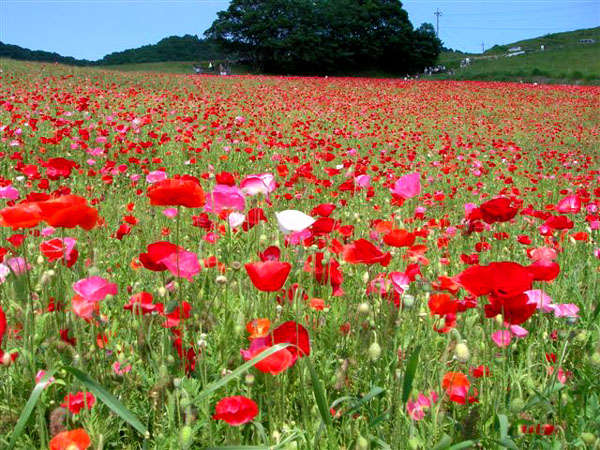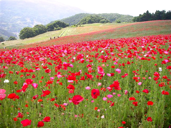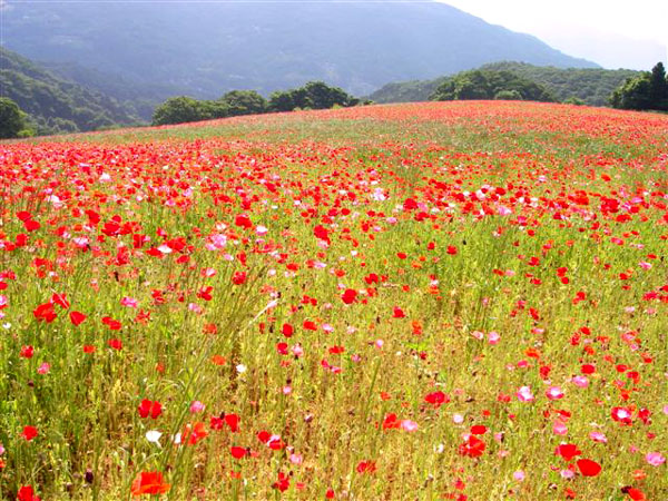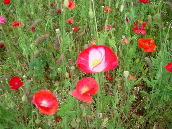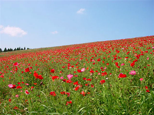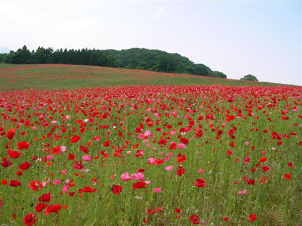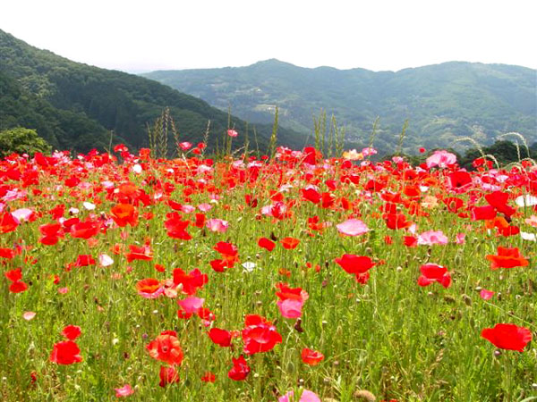 JR八高線・東武東上線の小川町駅から15〜20分(車で)の所、今年の開花は遅れたようで「ポピーまつり」を終えたあとでの満開となりました。のんびりと草を食む牛の群れを見ながら狭い「牧道」をぬけると、目も覚めるような広大なポピーの丘が広がります。ナント、「愛のシンボル〜〜〜ハート」に見える花もありましたよ!!