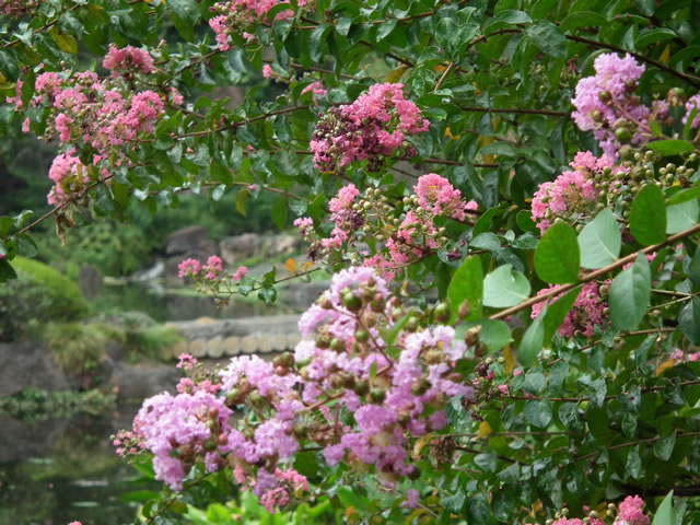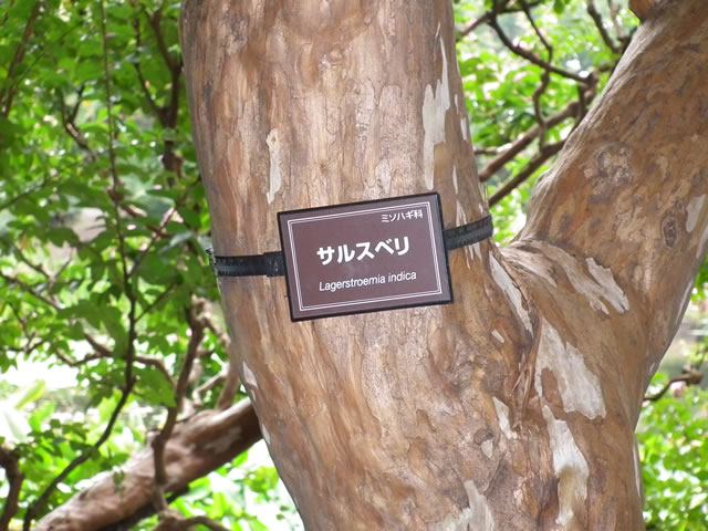 「サルスベリ」 比較的長期間花が咲いていることから、中国で「百日紅」と呼んだ、ところが日本では、樹皮がつるつるして猿が登れないだろうとして「猿すべり」と呼んだ。これを合わせて「百日紅と書いてサルスベリ」と読む。