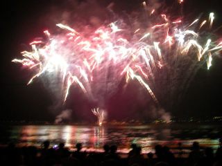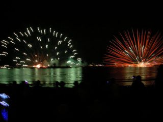 左右からの水中花火が、見事な色彩を放ちながら近づいて合体する「キッスオブファイア」には、観衆総立ちで大歓声がこだましました。