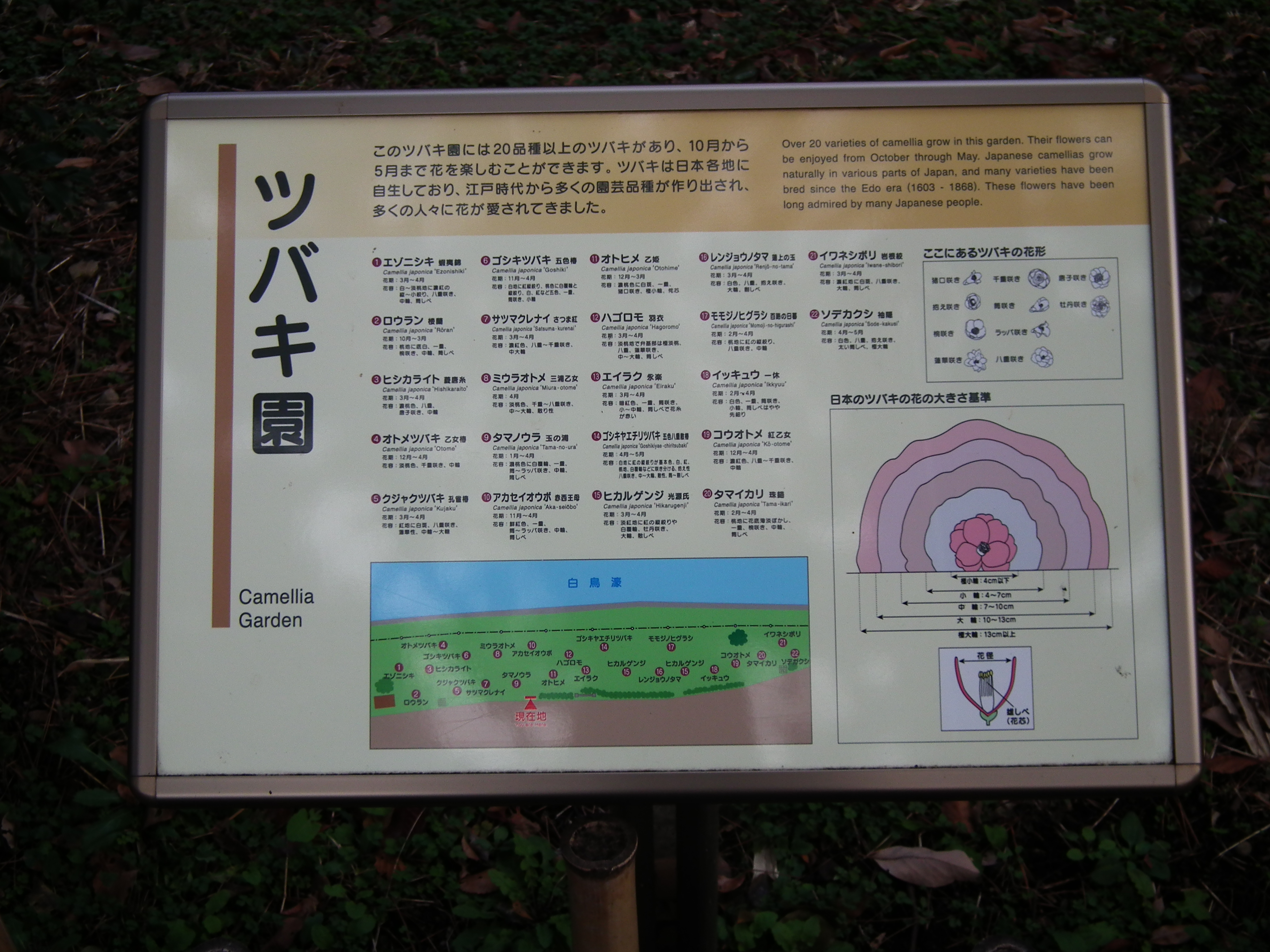 表示の文言:『このツバキ園には20種類以上のツバキがあり、10月から5月まで花を楽しむことができます。ツバキは日本各地に自生しており、江戸時代から多くの園芸品種が作り出され、多くの人に花が愛されてきました』。