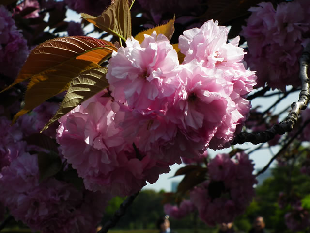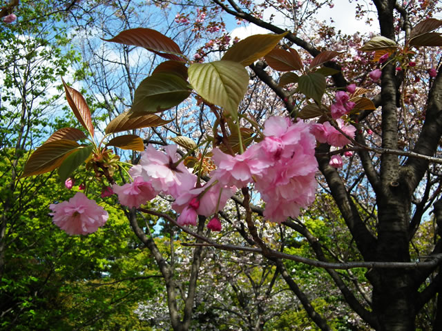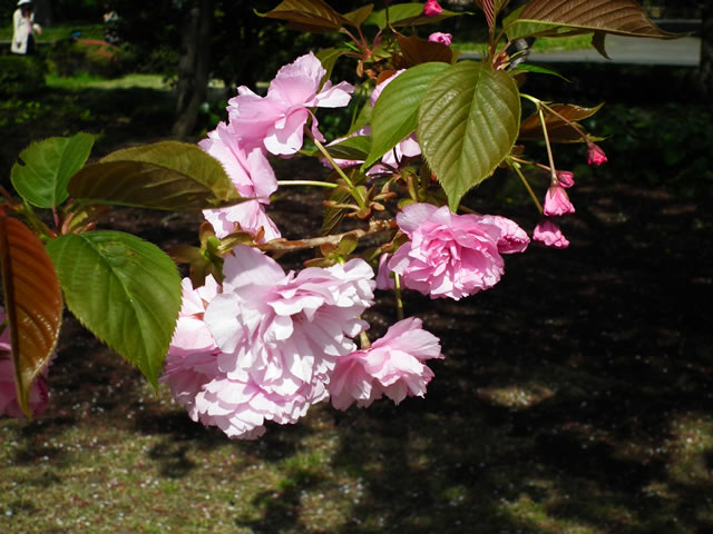 「花は大輪、八重咲き、濃紅色、八重桜の代表品種、花の塩漬けは桜湯となる。」