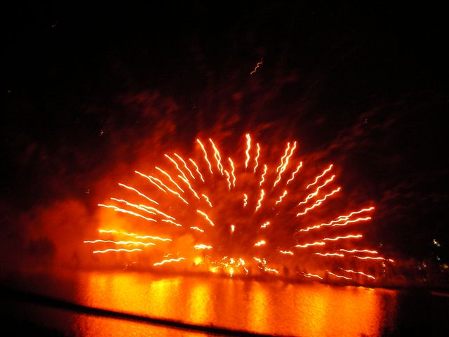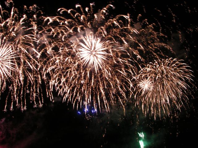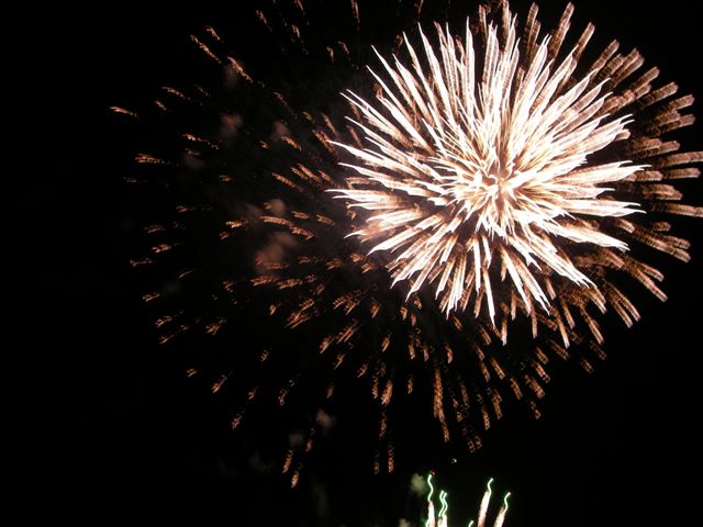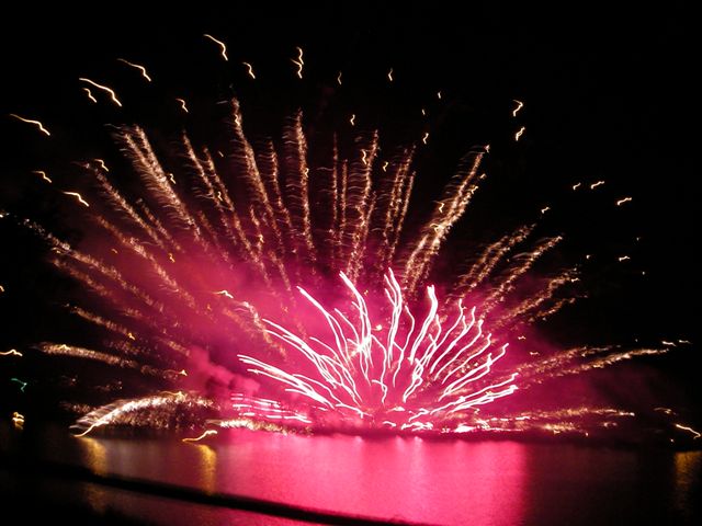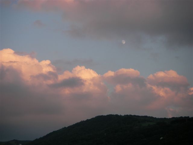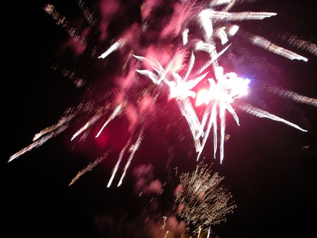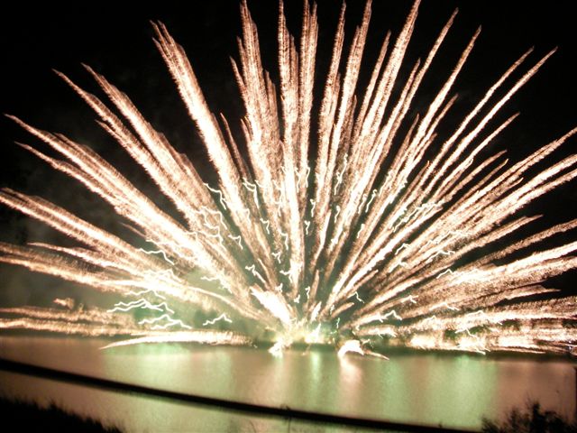 蓼科山をバックに白樺湖花火大会の舞台・中ノ島上空に夕月が懸かると、間もなく煙火師さんたちの登場です。慰霊花火に始まり、復興祈願で結ぶ1500発が山並みに響きわたり、終了時には湖畔の大観衆から煙火師さんへ「ありがとう!」の唱和と共に一斉に「感謝」のライトが振られて、信州の往く夏を惜しみました。(3C