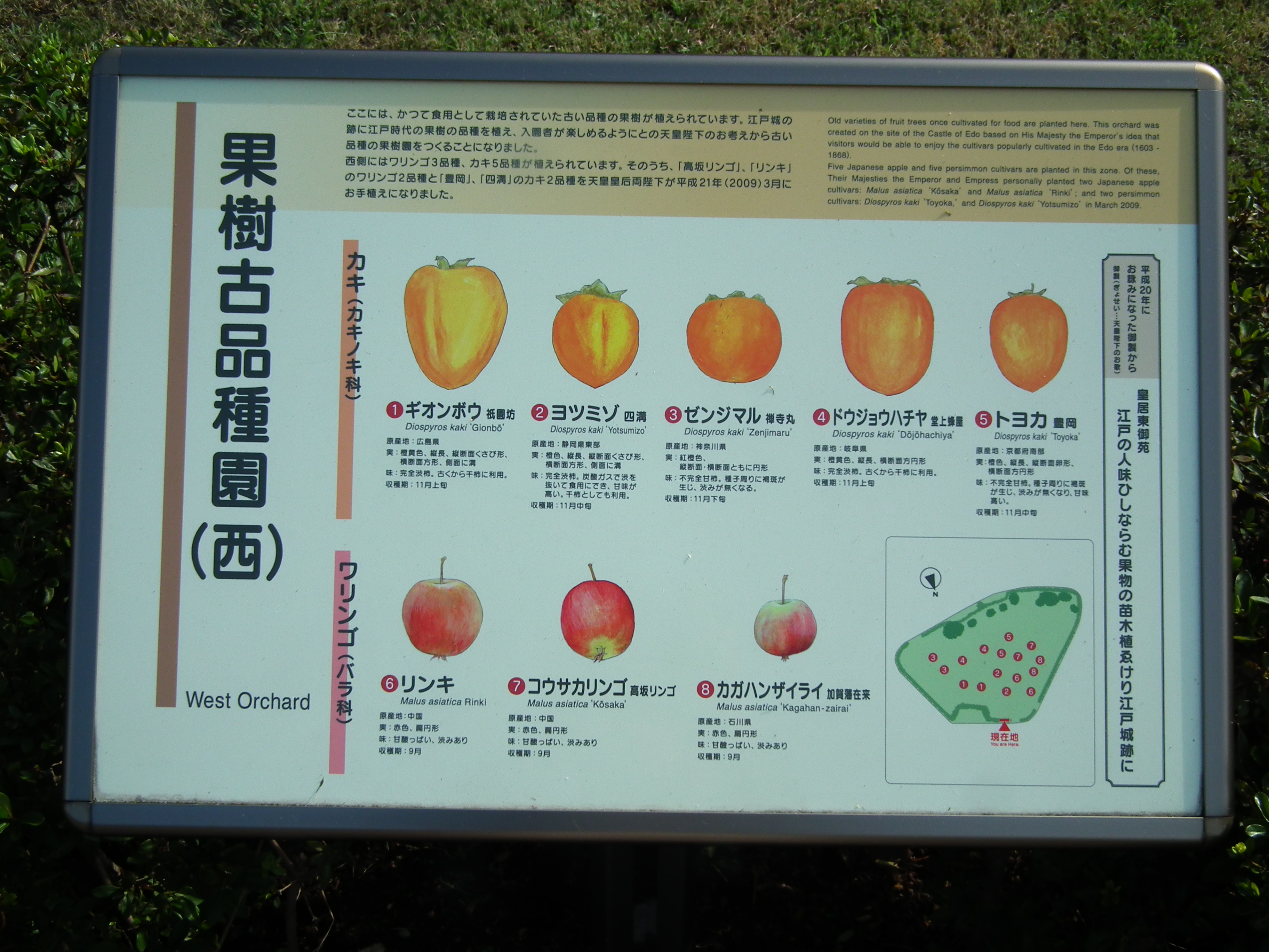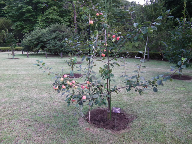 「果樹古品種園」 『食用の植物は,より美味なものやより生産性の高いものが栽培されるようになると,古い品種はすたれてしまい,一般には見ることができなくなってしまいま す。江戸城の跡である皇居東御苑に江戸時代の品種である果樹を植えれば,訪れる人々にとっても興味深いことではないかとの天皇陛下のお考え』を受けて,果樹古品種を植栽した果樹園が整備されたものです。 (画面クリックで超拡大)