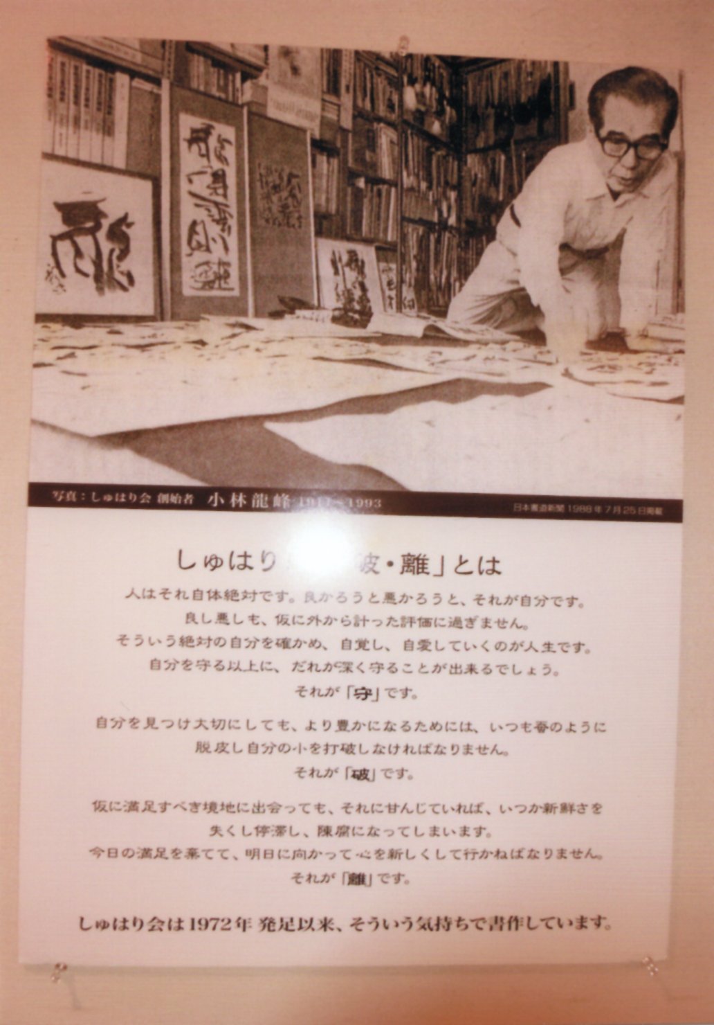 「しゅはり会」は、都立戸山高「書道」の担任・故:小林秀雄(龍峰)先生が創始されたもので、 現在は、龍峰先生のお身内の小林鯨先生が主宰されています。龍峰先生は 「人それ自体が絶対です。良かろうと悪かろうと、それが自分です。・・・・・」と目録末尾の『しゅはり「守・破・離」とは』に解説されています。