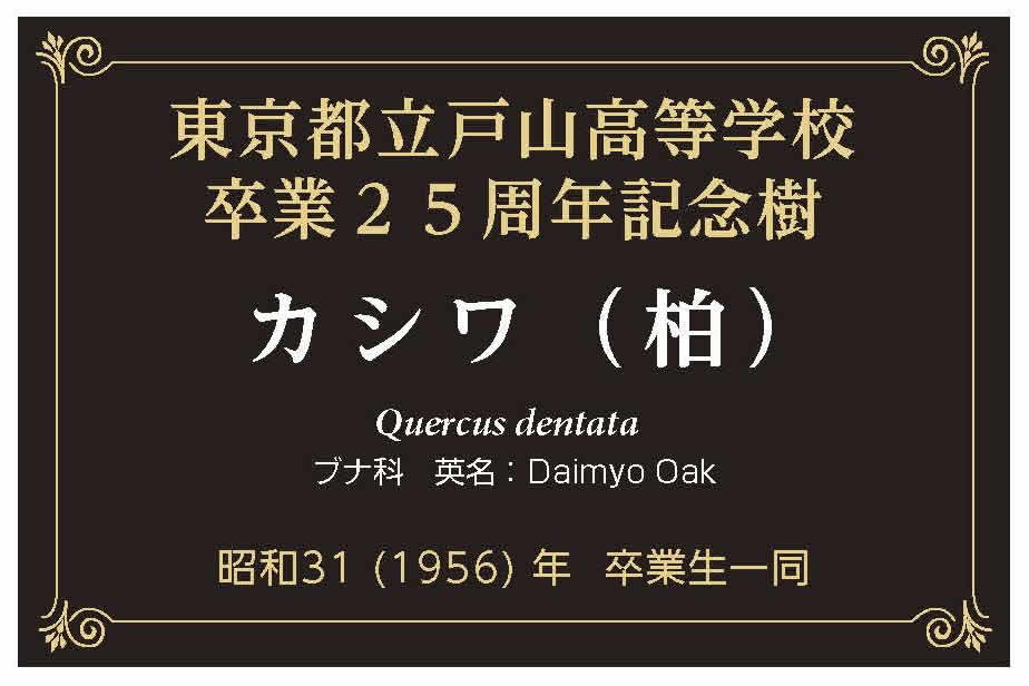 その後40余年、木柱は霧散しましたが、生命ある柏の木は新校舎改築後も「ビオトープ」にて成長しています。今回、生命無き石碑などでなく、成長する柏本体に「由来を記した樹名板」(←クリックで拡大)を託す計画とのことです。120mm X 80mm サイズで仰々しくなく、耐候性材質で5~7年は十分保つ、予備を作っておけば、誰かが100歳になるころまで大丈夫だろうとの判断だそうで、ぜひ学校にお願いし設置させて頂けたらと思いました。都立戸山高校の発展と柏の成長、そして同期生の無事を祈りつつ、御報告致します。 (以上)