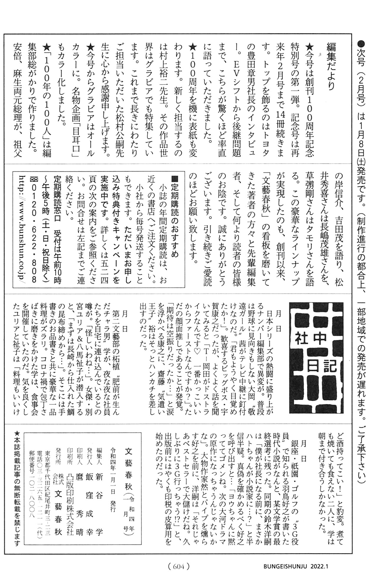 - 書籍名 : 文藝春秋2022年1月号