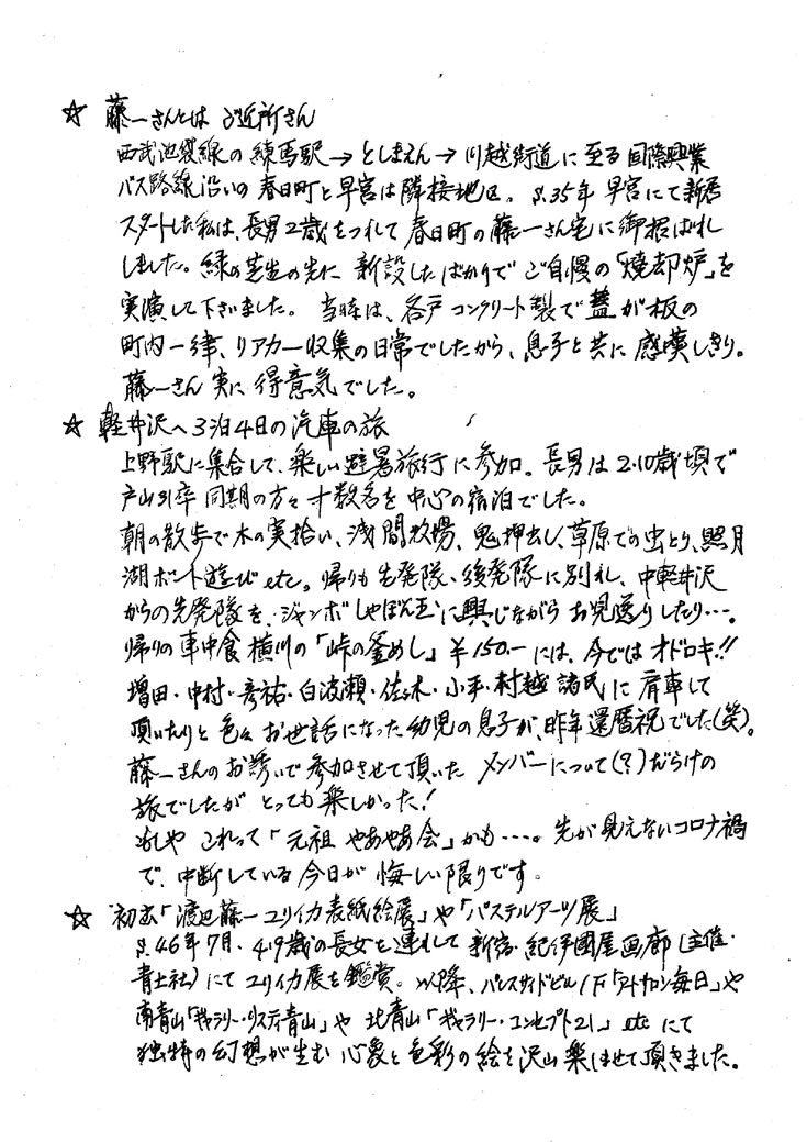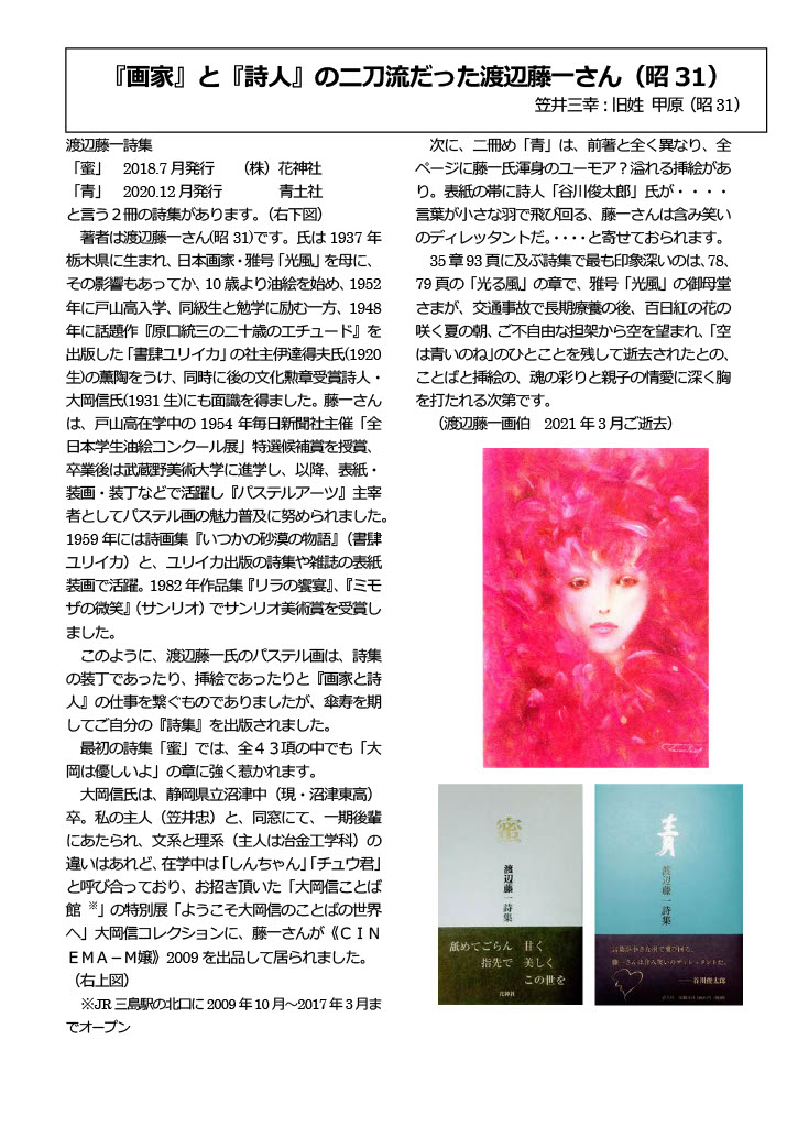 渡辺藤一さまは、自然発生的な同期生のあつまり「やあやあ会」の設立に深く関係し、その後も多くの場面で貢献されました。特に「卒業50周年記念誌(CD)」の作成、2014年の金メダル・喜寿会合のデザインなどであります。ご本業の絵画・詩集については、城北会誌第70号に投稿し掲載されておりますが、その他のご活躍についても記述し、追悼させて頂きたく存じます。