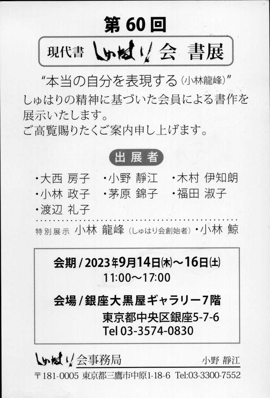 『しゅはり会』は、都立戸山高校の恩師、小林龍峰先生が創始され、ご子息の鯨先生が継承して居られた会で、現在は同期小野静江さまが『書展』の事務局を鋭意努めておられます。