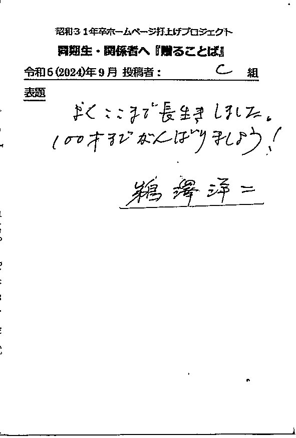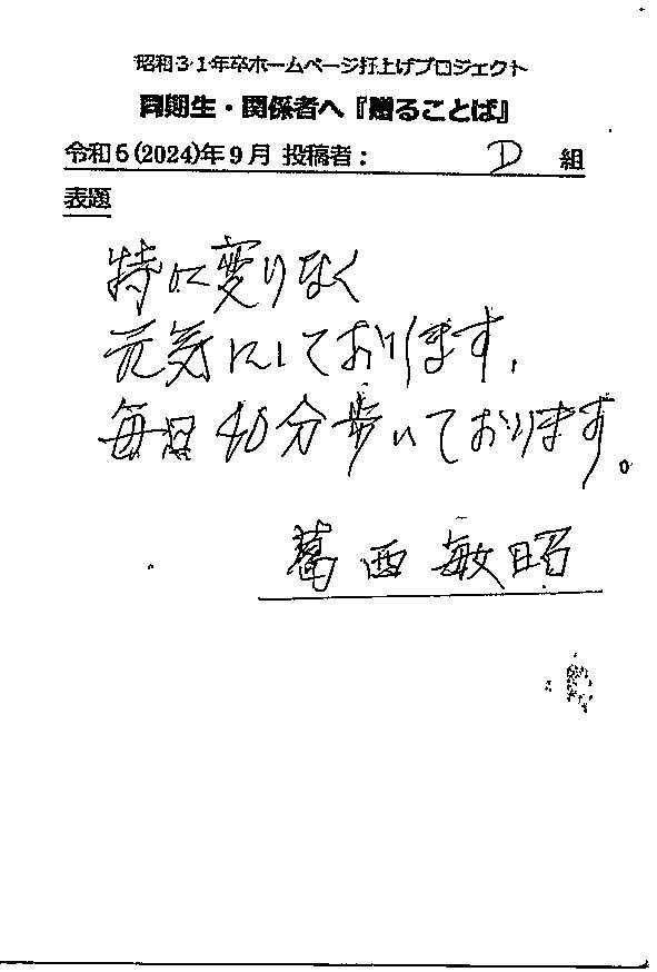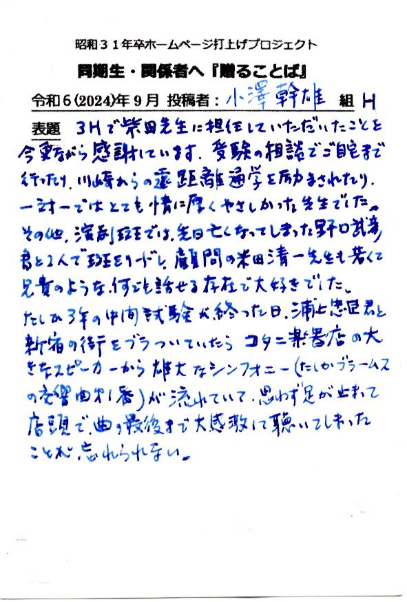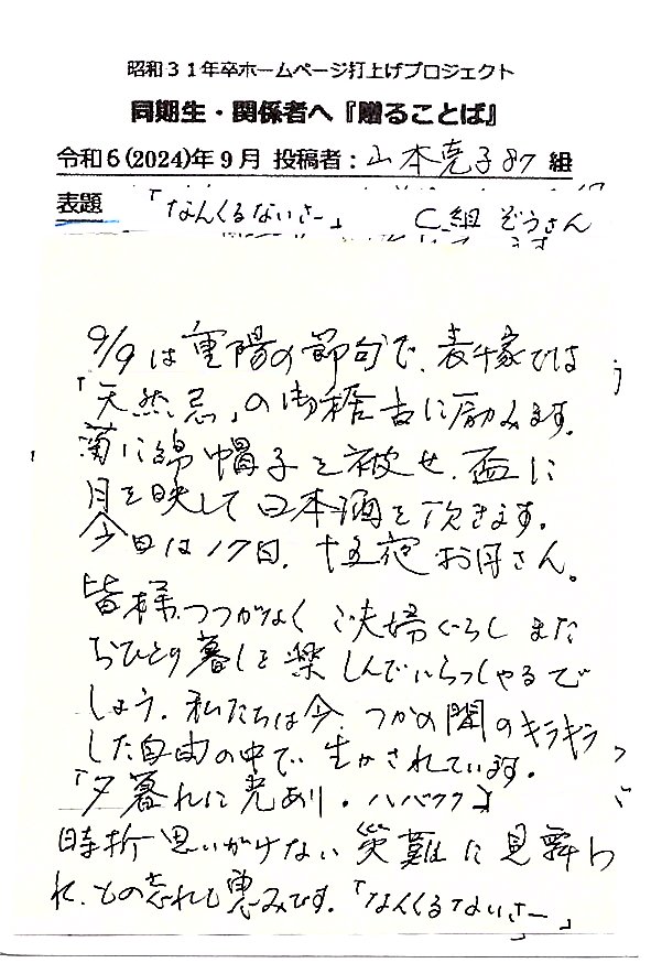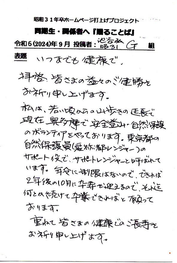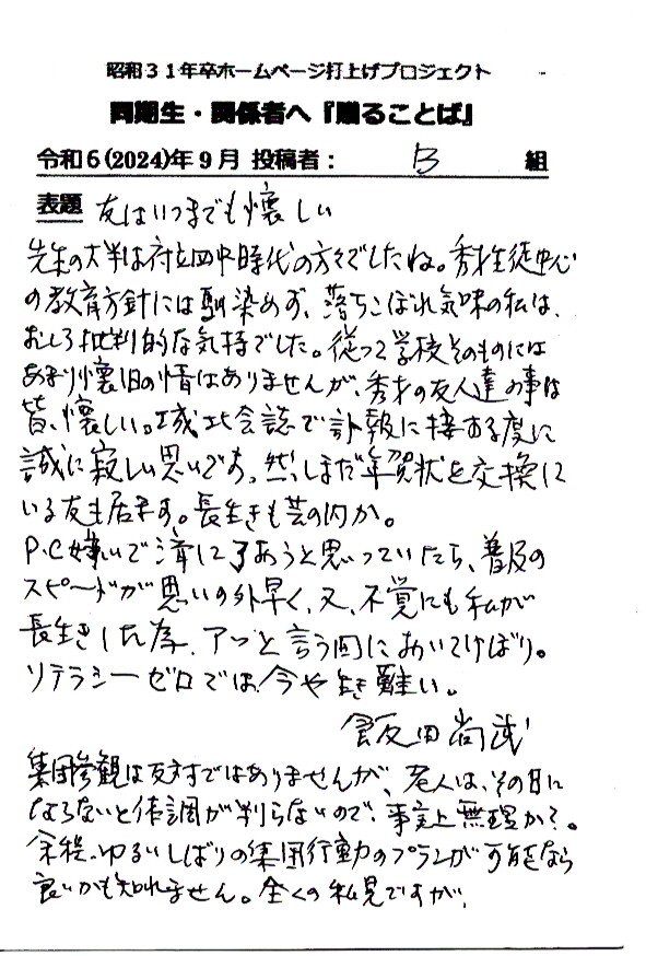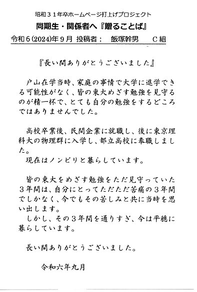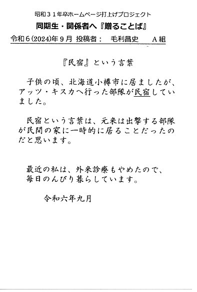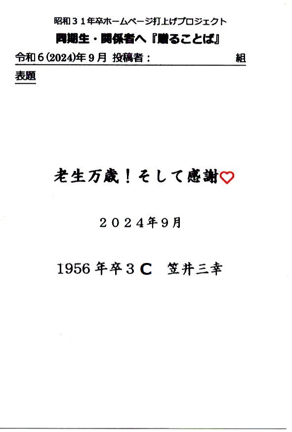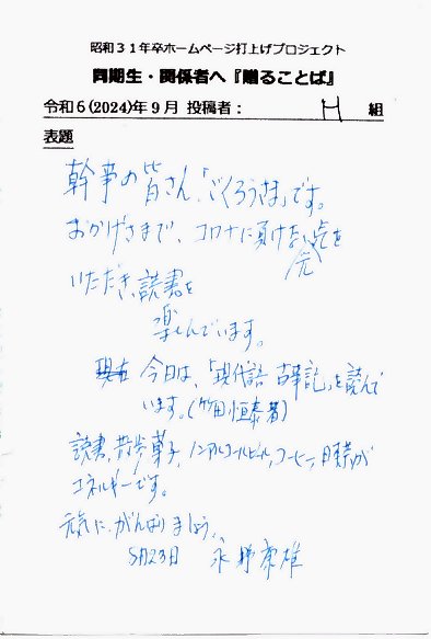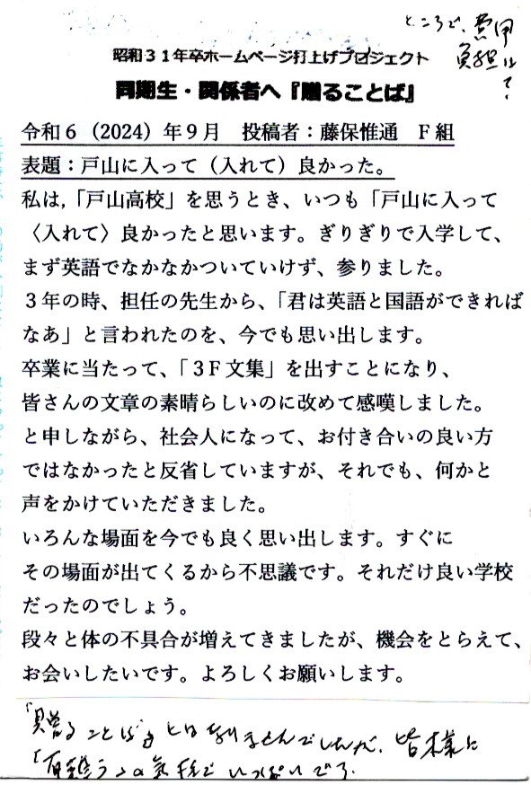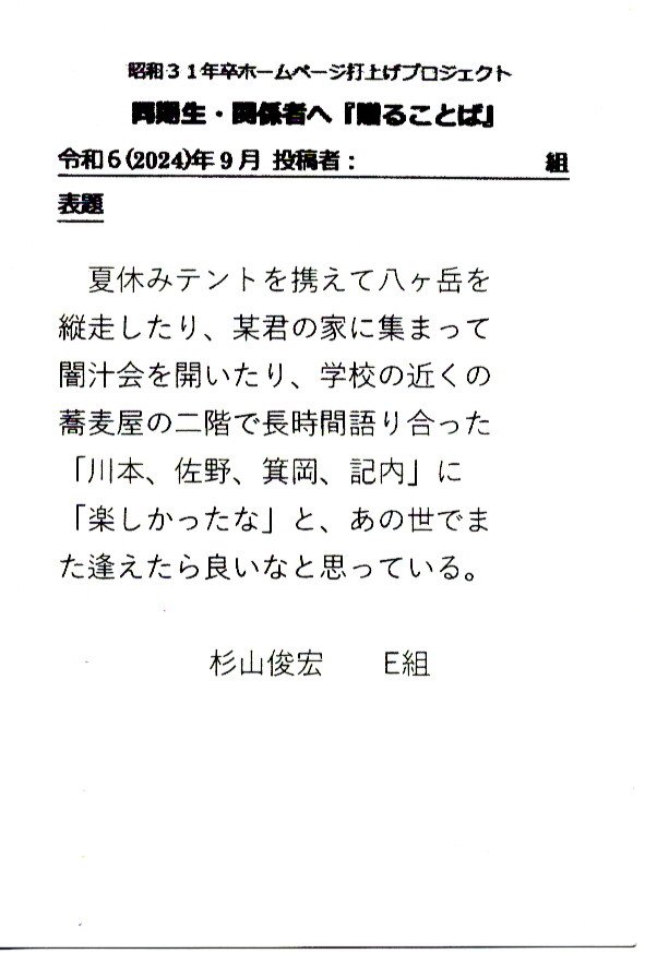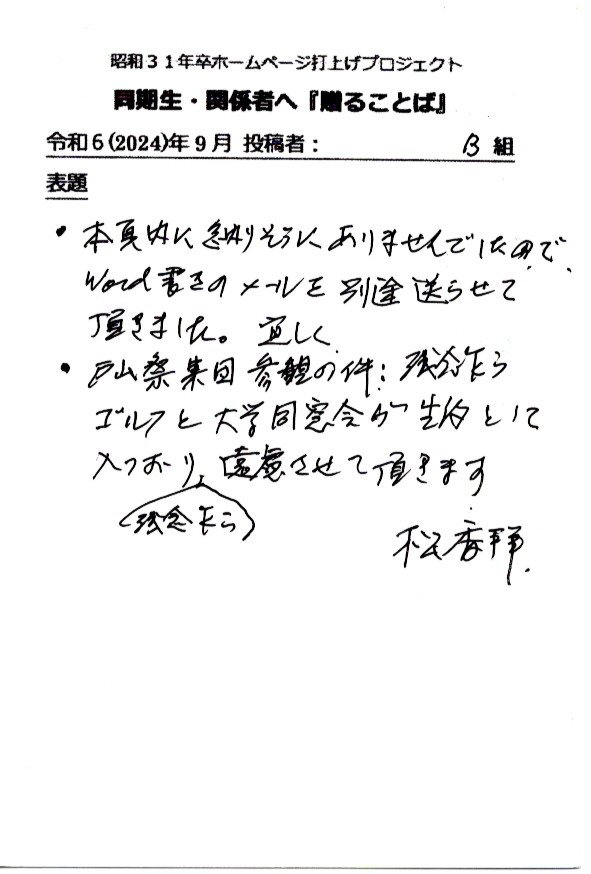 - 同期ホームページ最終投稿のお願いとして『贈る言葉』を往復ハガキでお願い致しました。従来はヤアヤア会に、ご出席頂けなかった方々も含め、突然のお願いにも拘らず多くの『お言葉』をとうじの頂戴しております。