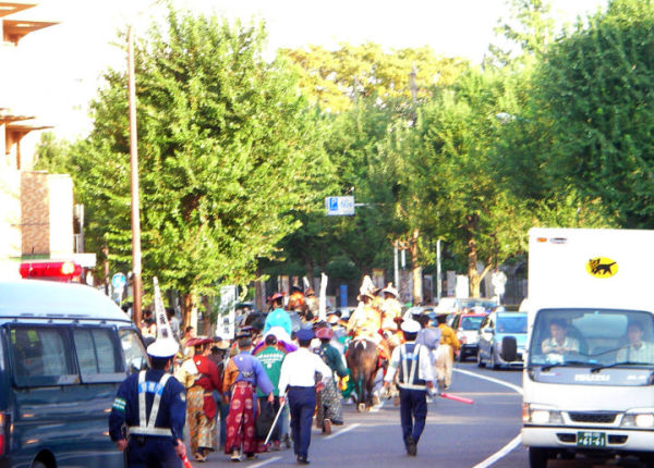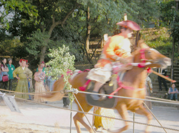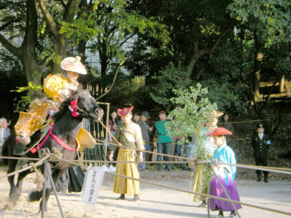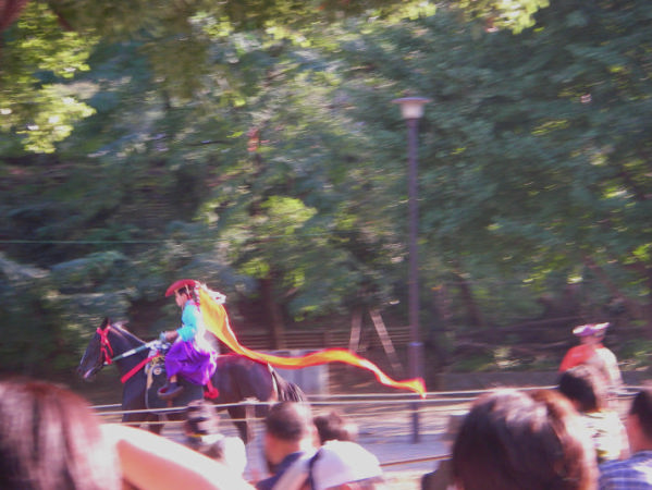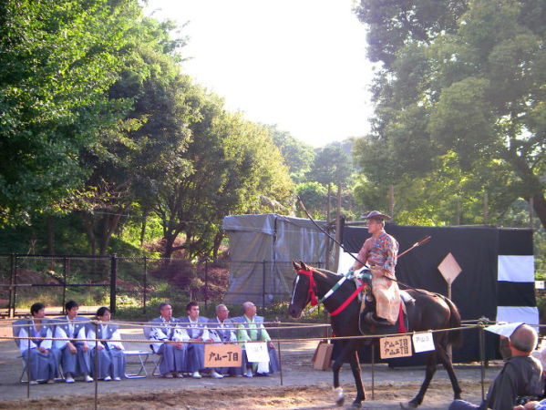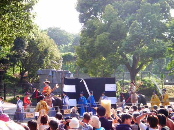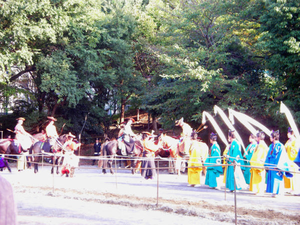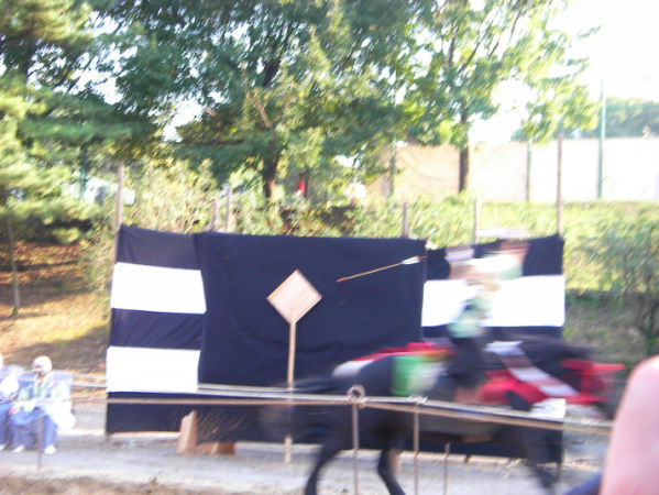 射手・諸役・介添の方々が装束を整えて『拝礼』の後 パレードに移り、午後2時頃には都立戸山公園に至り、『神的之中』的中して真っ二つの場面は、神馬の姿にもホレボレです。