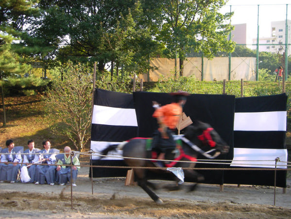 古式(小笠原流)豊かで勇壮な神事に酔いしれる3,000名近い観客の歓声と『的』を射る快音が響き渡りました。